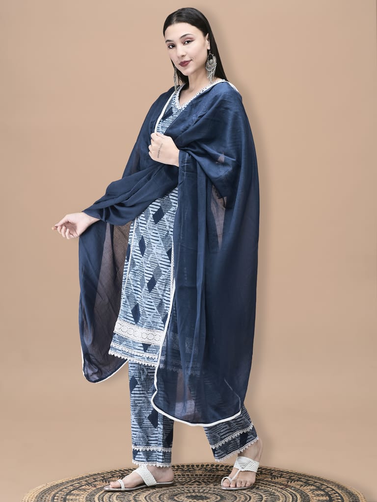 Women Cotton Blue Geometric Print Kurta Comfort Pant Dupatta