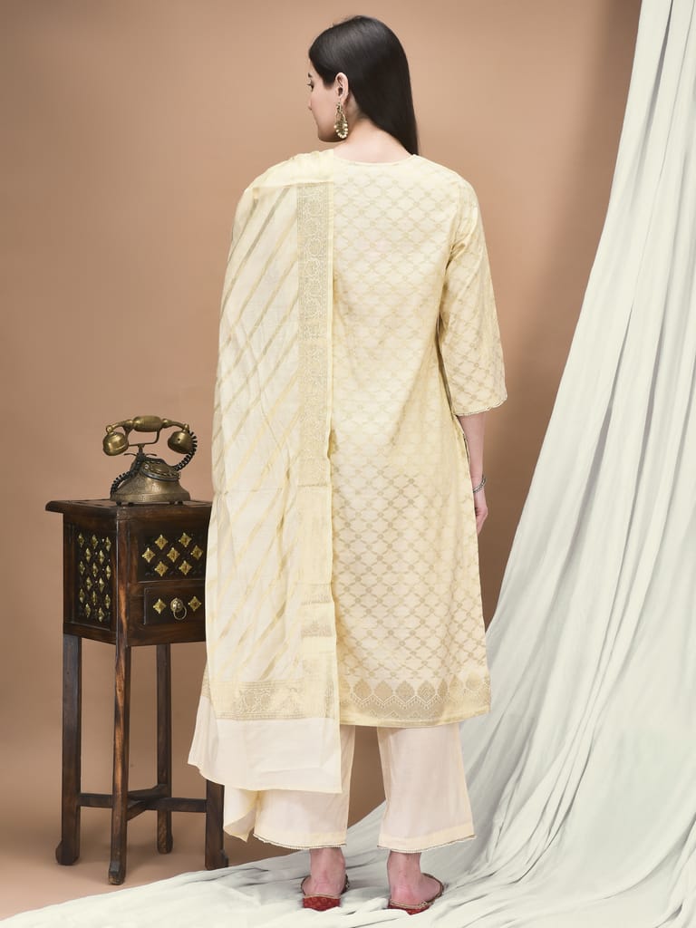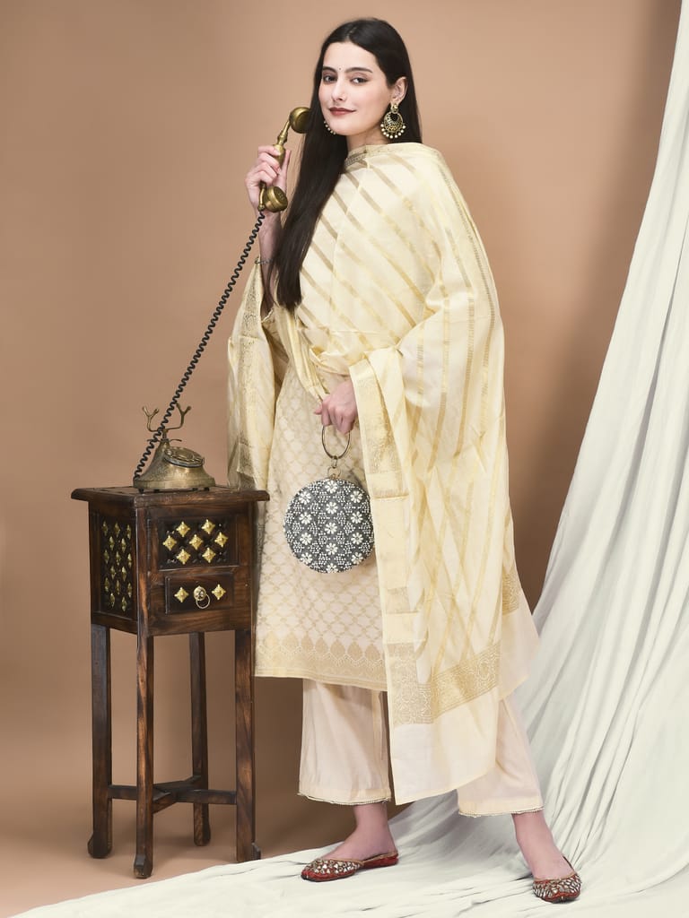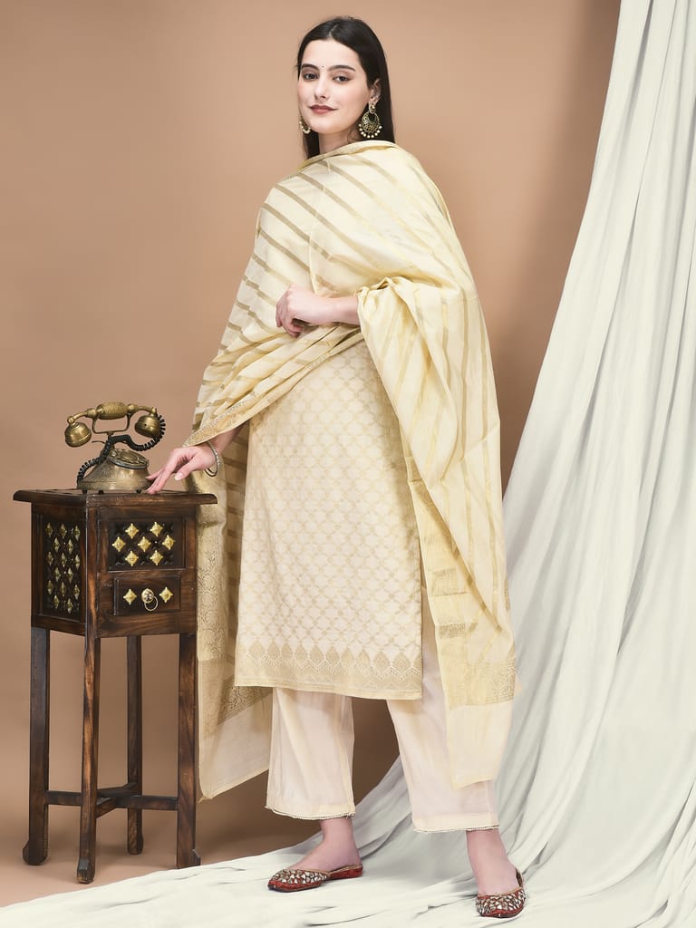 20502OFFWHITE-MWomen Cotton Jacquard Beige Woven Kurta Comfort Pant Dupatta