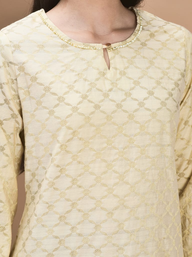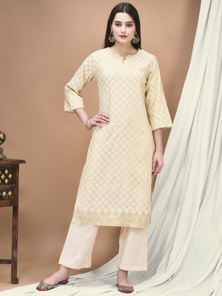 Women Cotton Jacquard Beige Woven Kurta Comfort Pant Dupatta