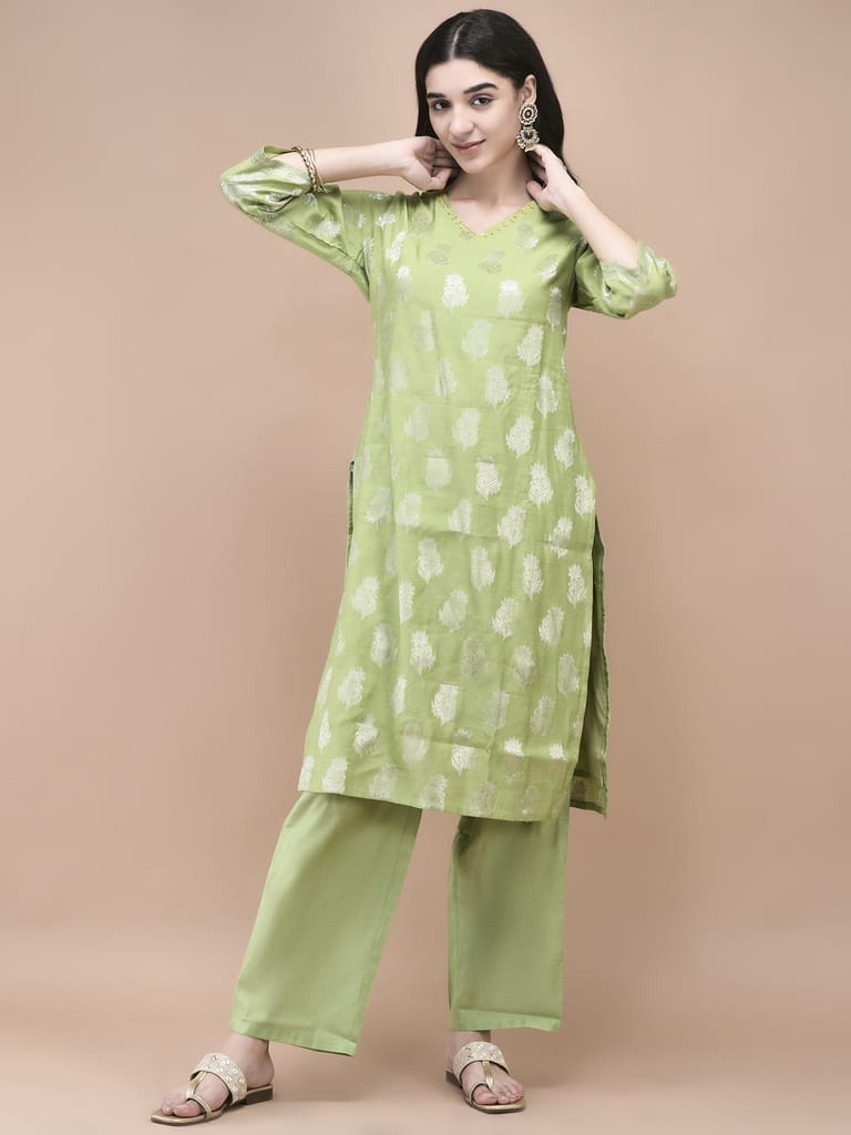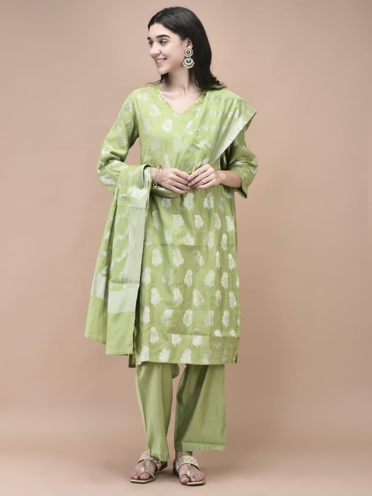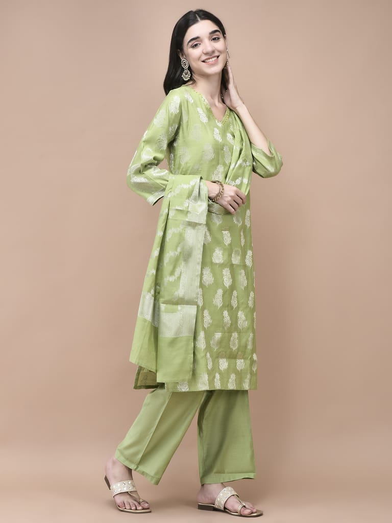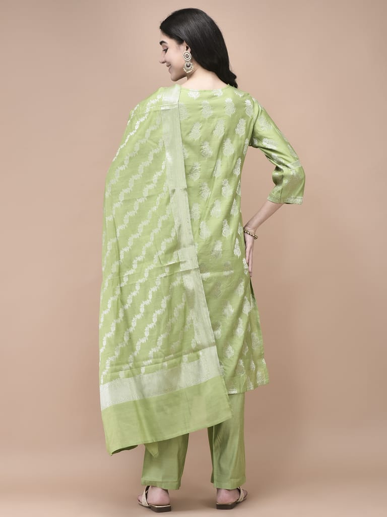 Women Cotton Jacquard Green Woven Kurta Comfort Pant Dupatta