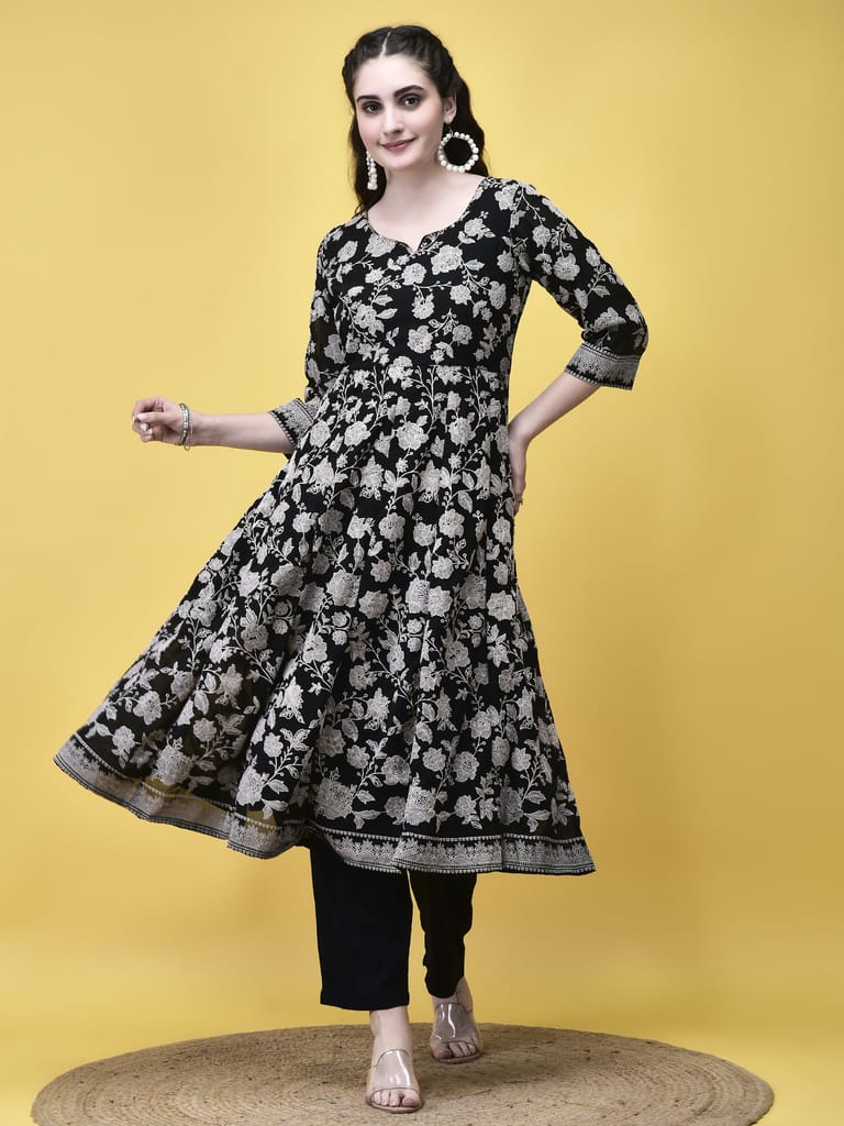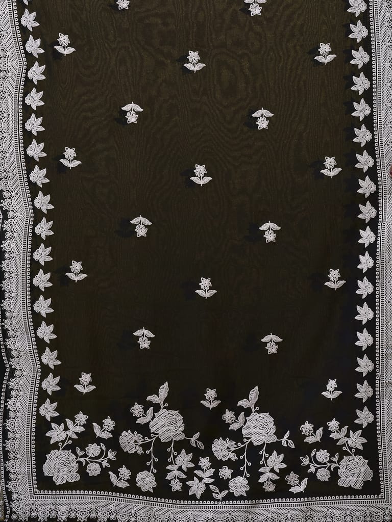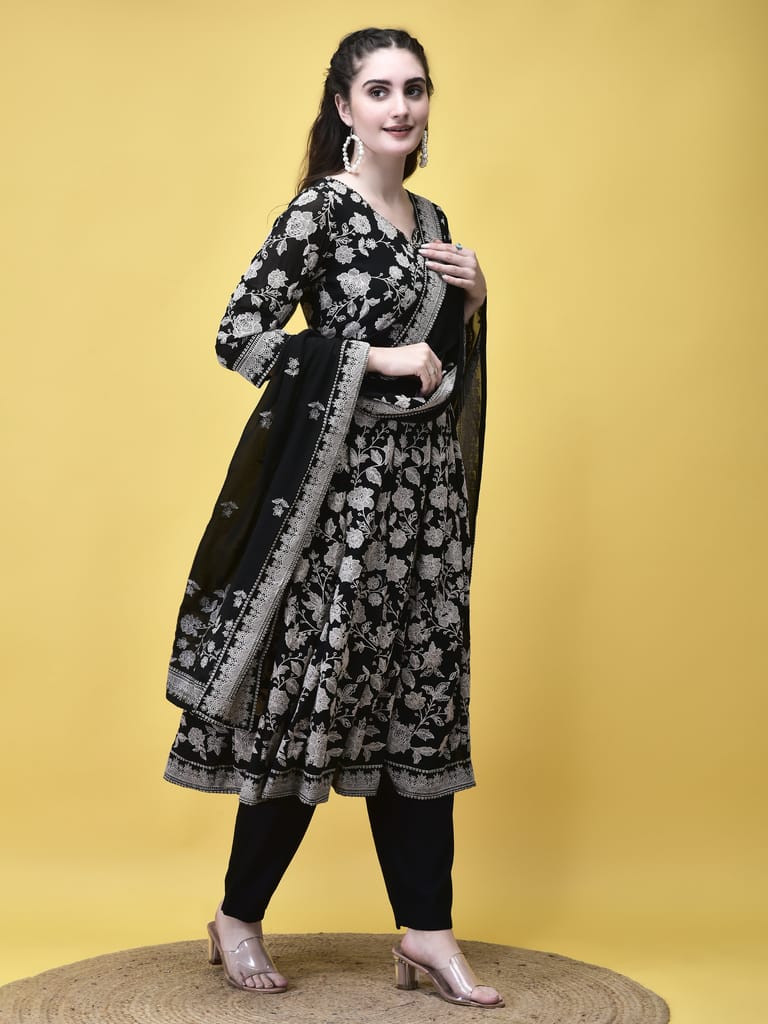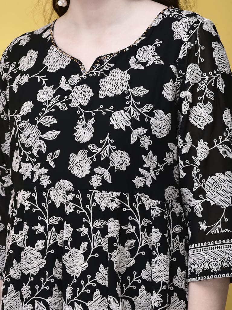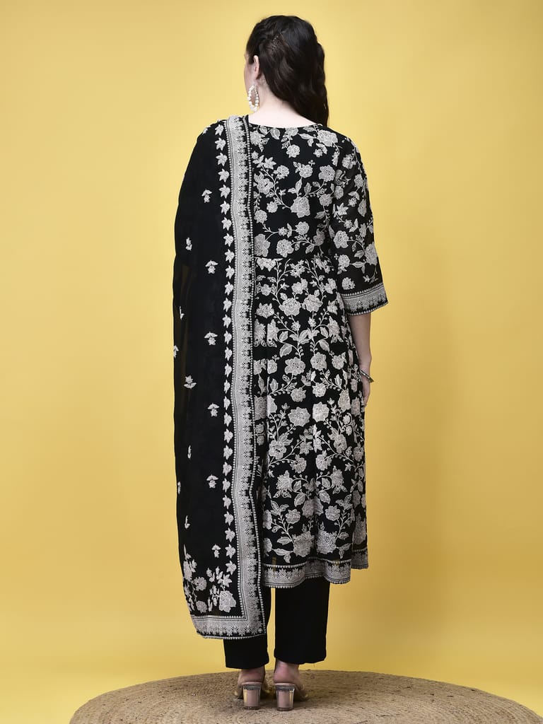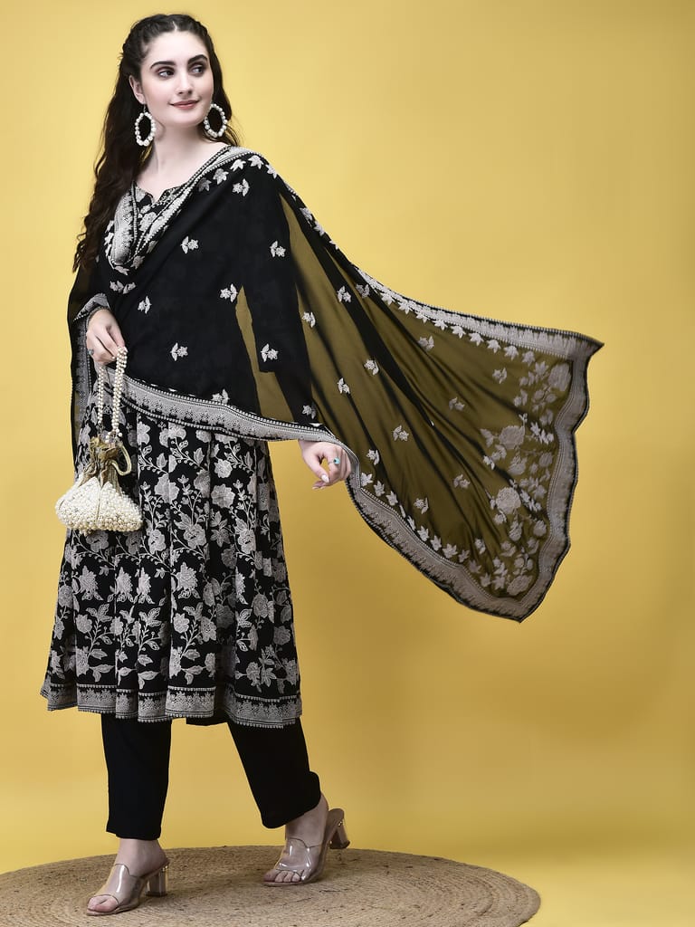 Women Georgette Black Emboss Floral Print Kurta Trouser Dupatta