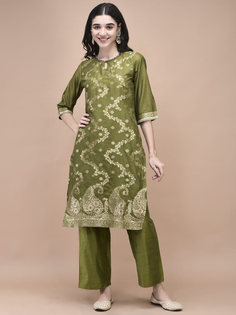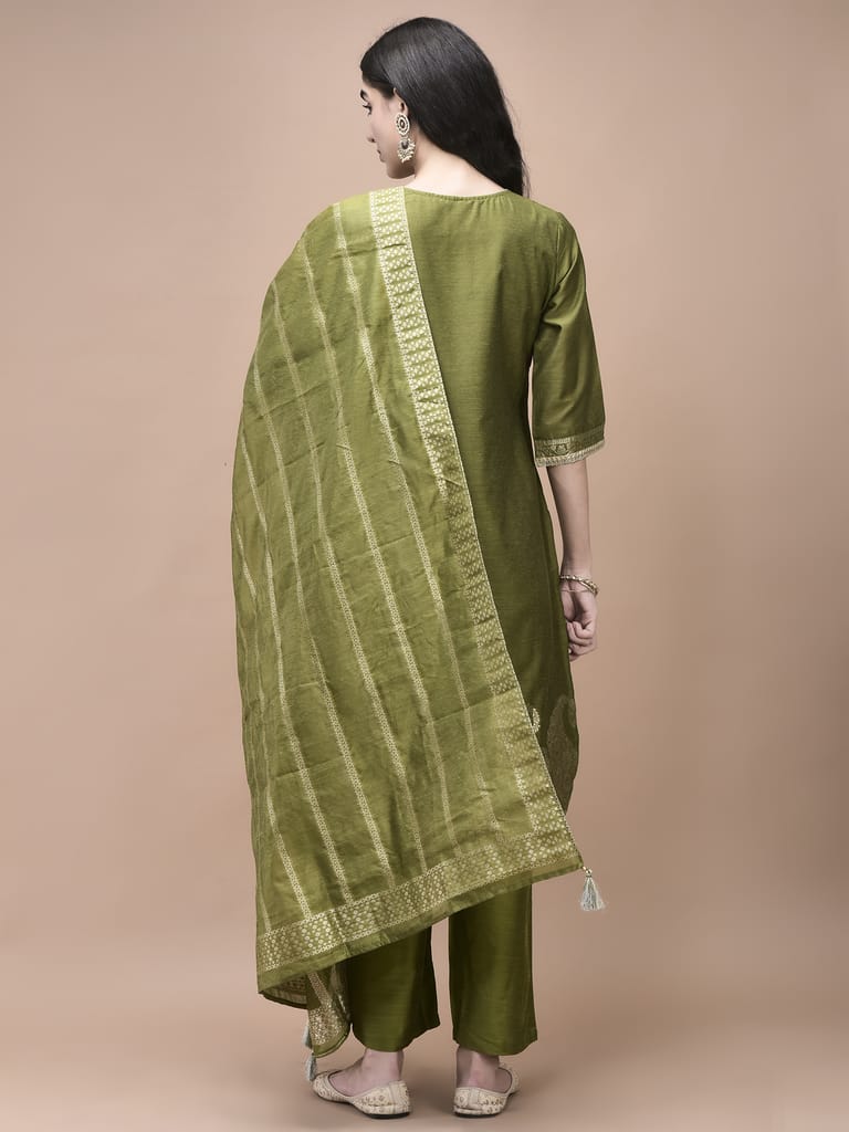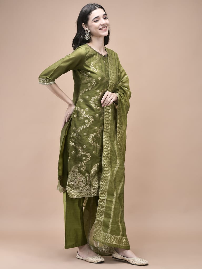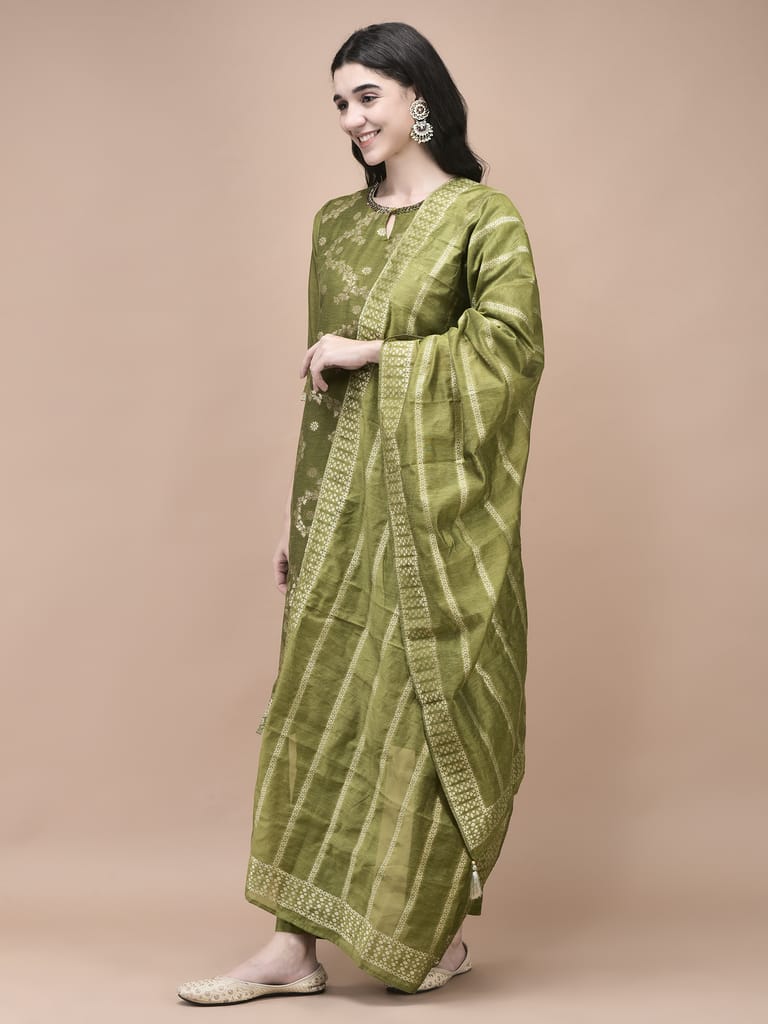 20101OLIVEGREEN-MWomen Jacquard Green Woven Kurta Comfort pant Dupatta