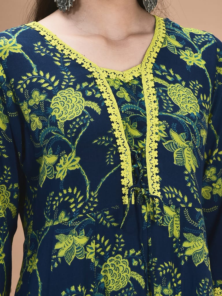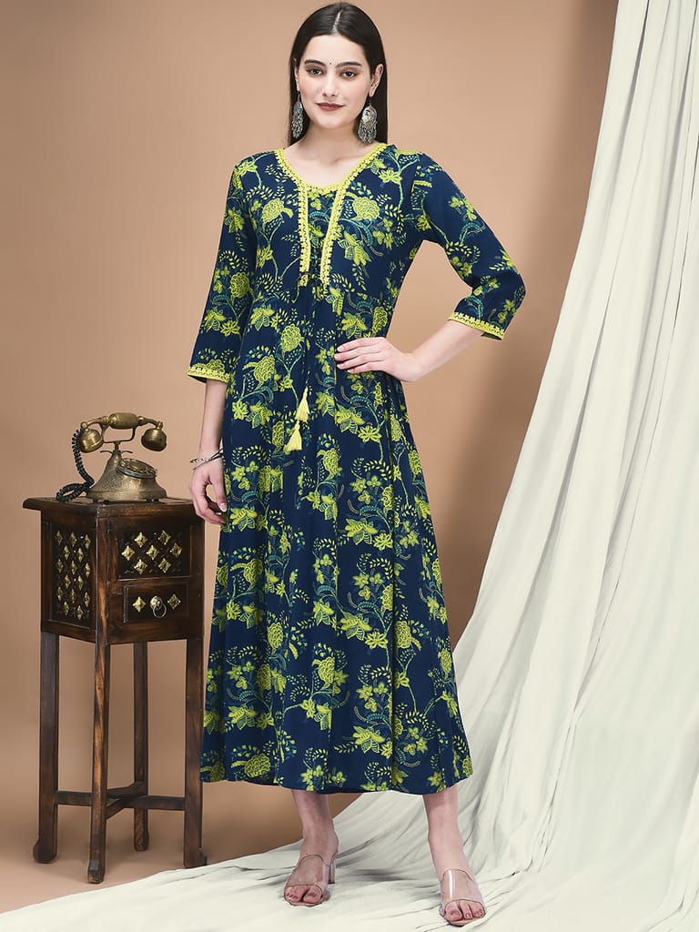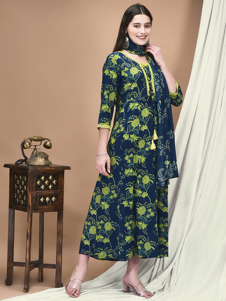 20013BLUE-SWomen Liva Blue Floral Print Dress With Dupatta