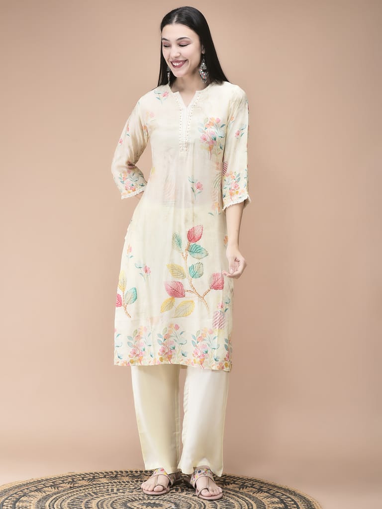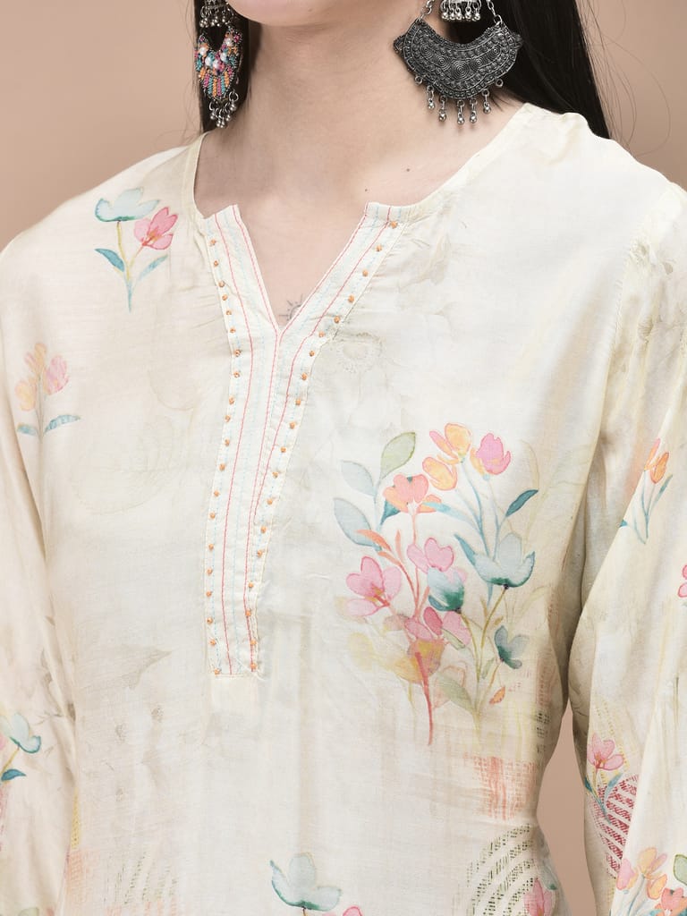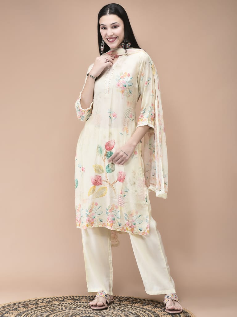 Women Muslin Cream Placement Print Kurta Comfort Pant Dupatta