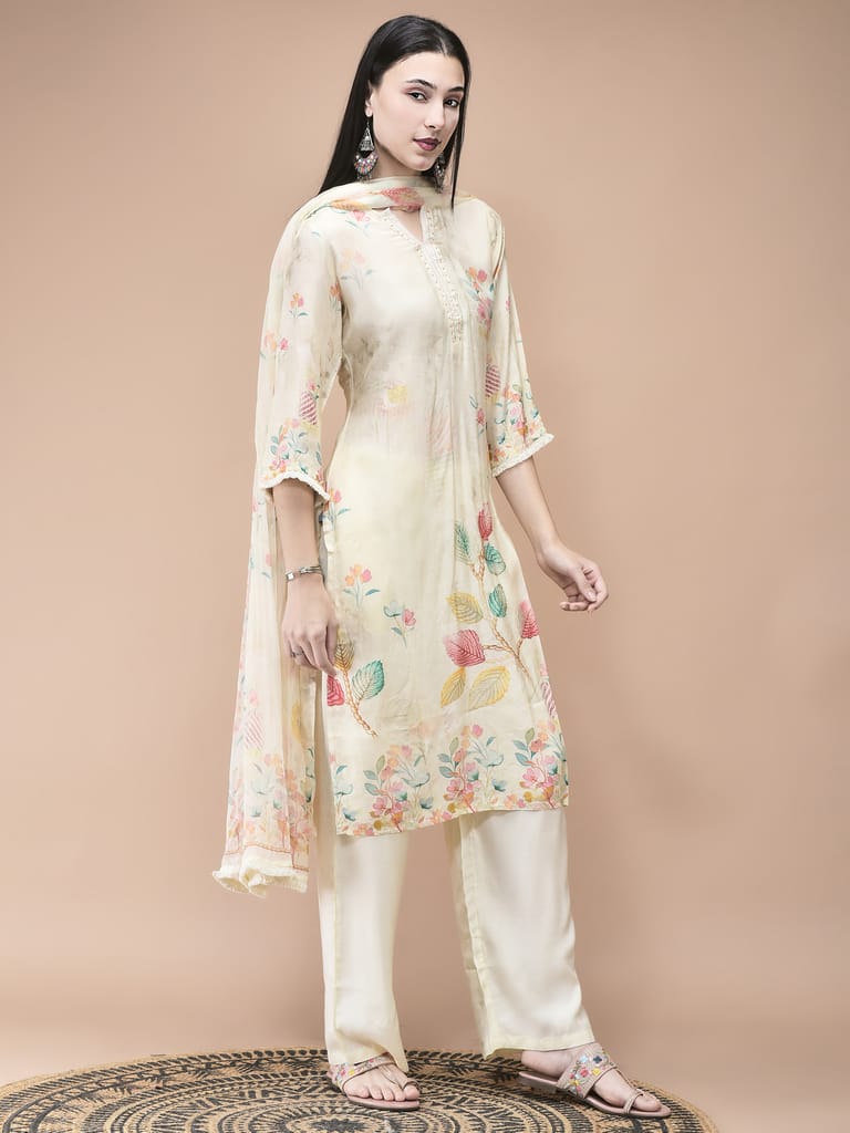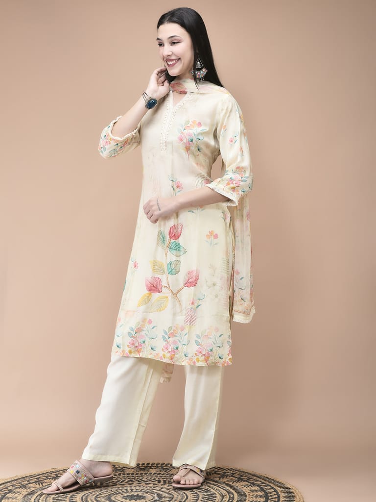 20570_CREAM MULTI-SWomen Muslin Cream Placement Print Kurta Comfort Pant Dupatta