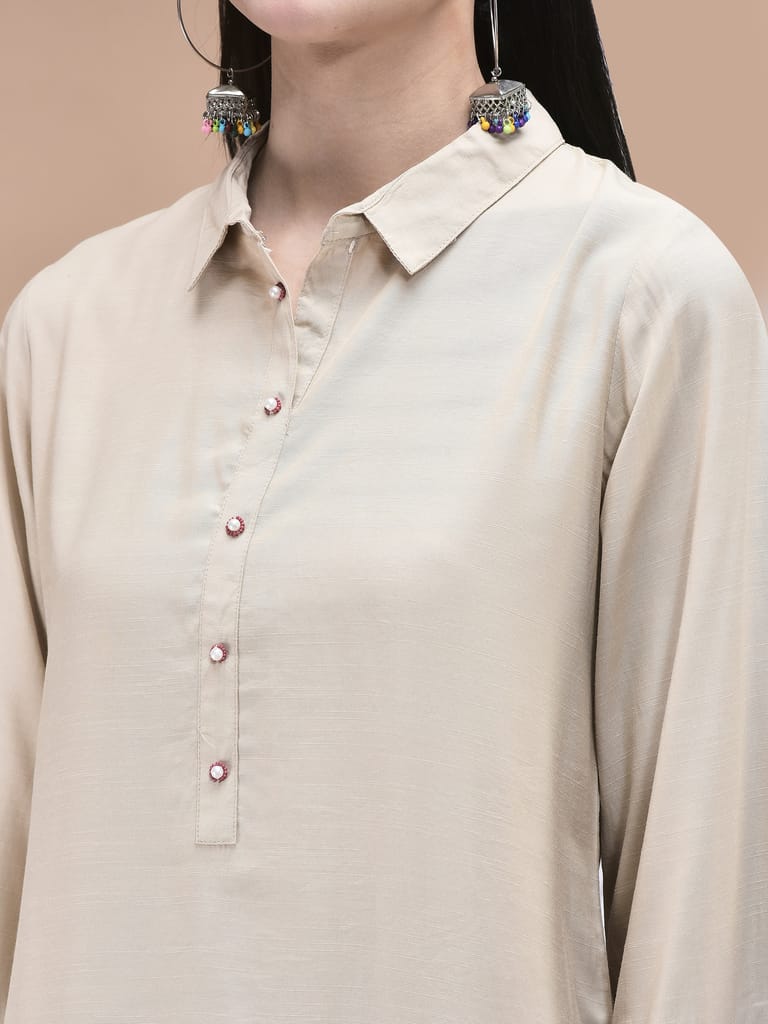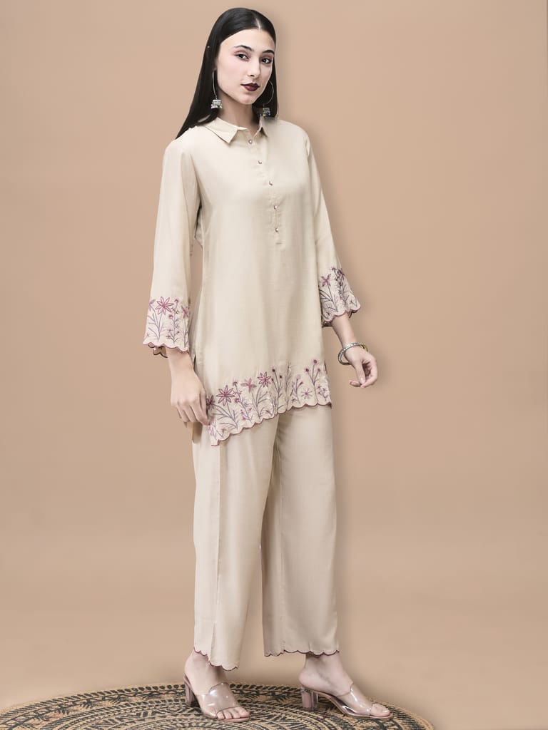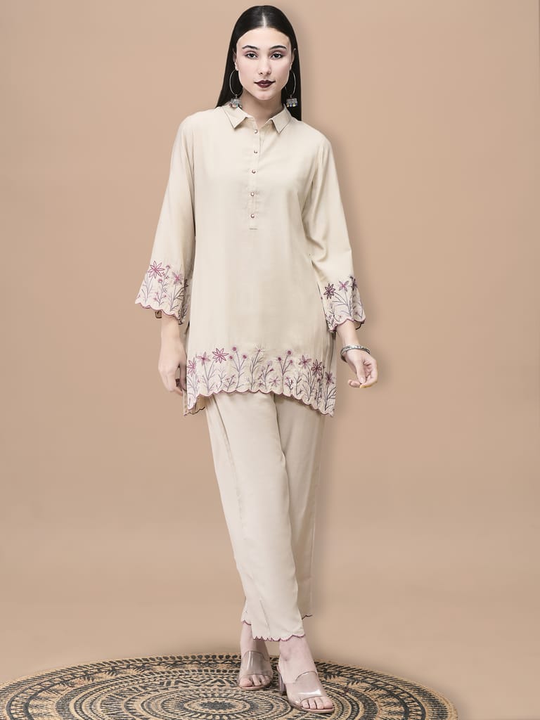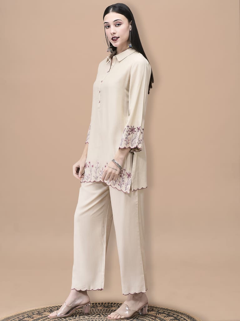 Women Poly Viscose Beige Embroidered Co-Ord Set