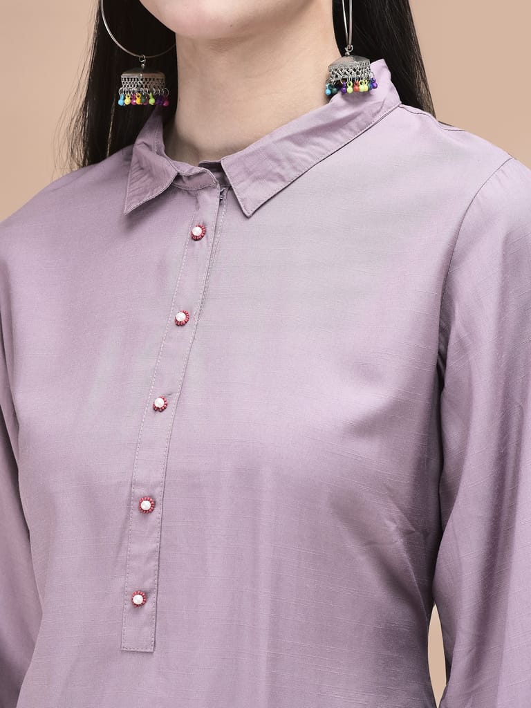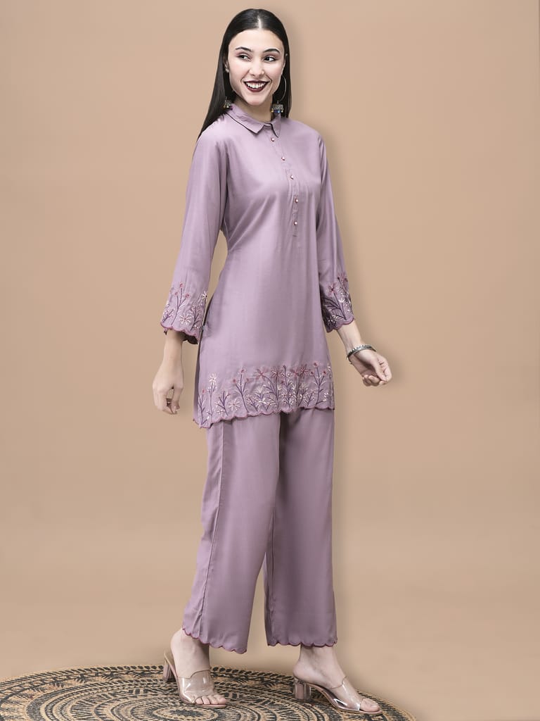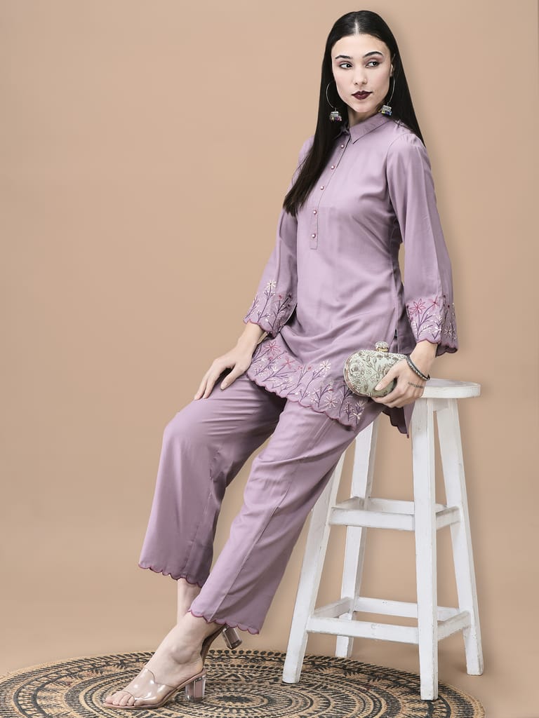 Women Poly Viscose Lilac Embroidered Co-Ord Set