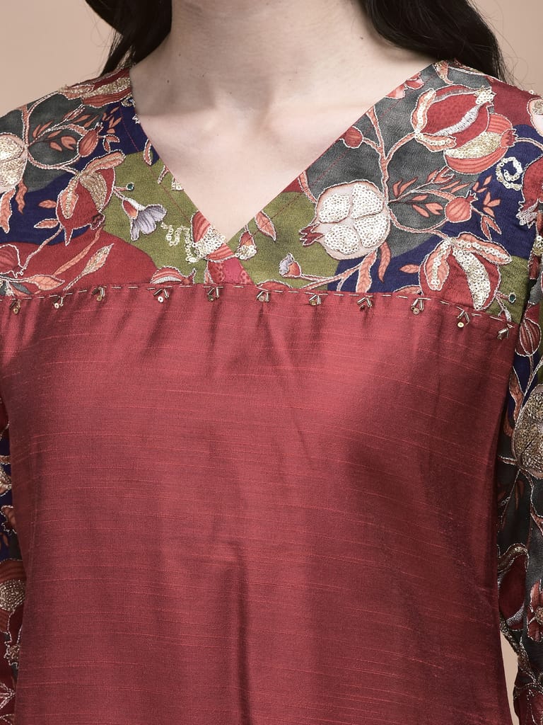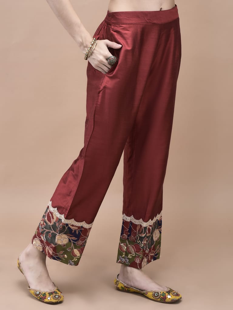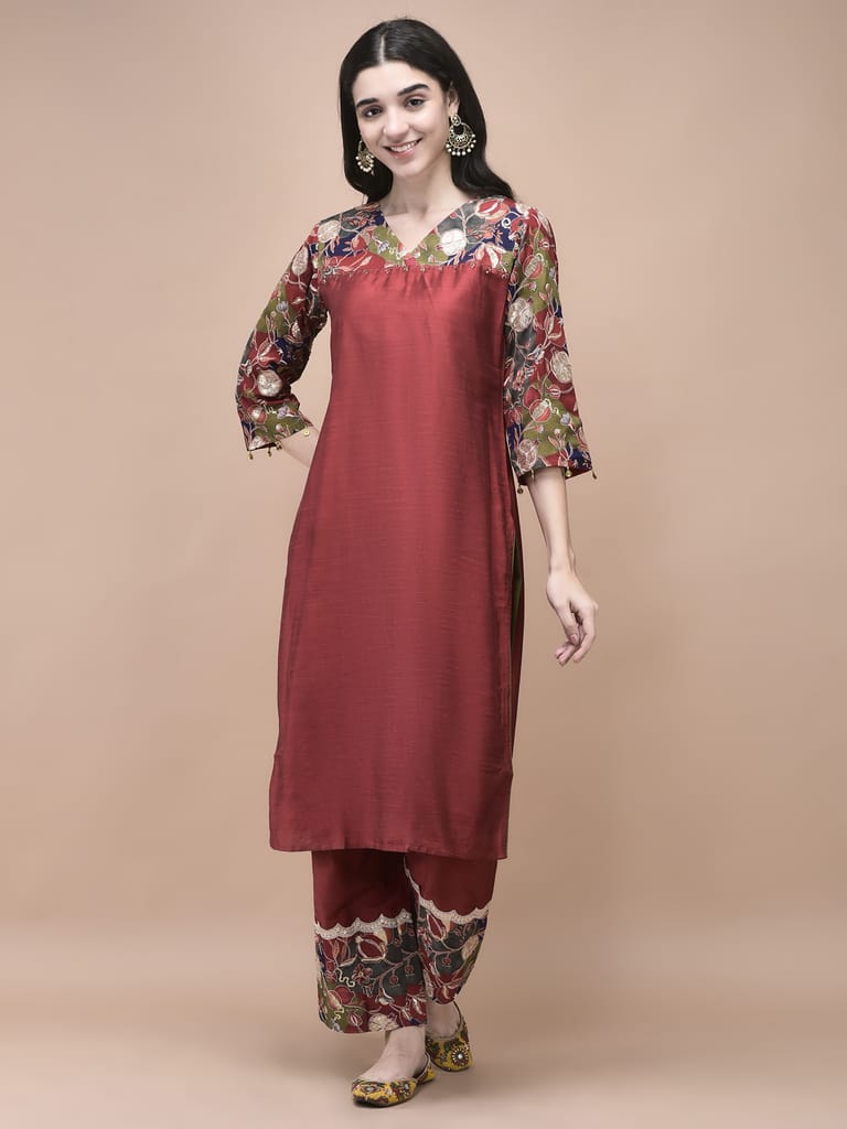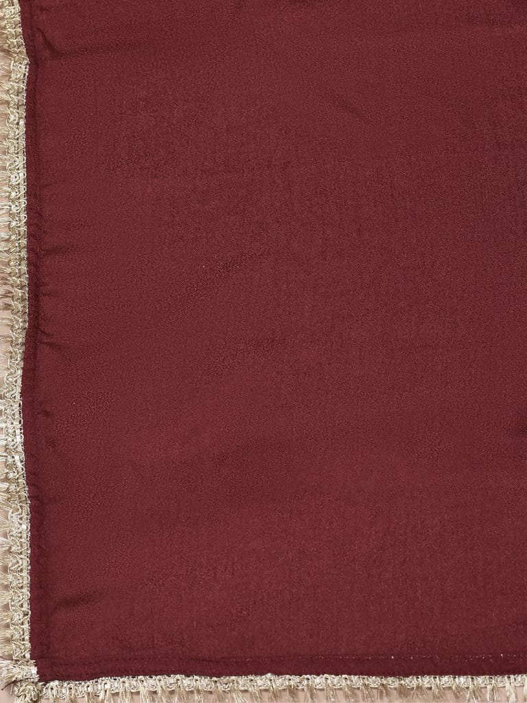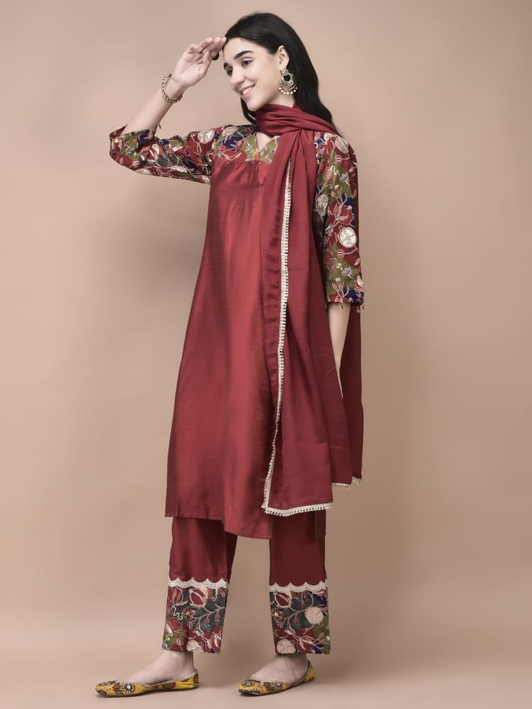 Women Silk Blend Maroon Embroidered Kurta Comfort Pant Dupatta