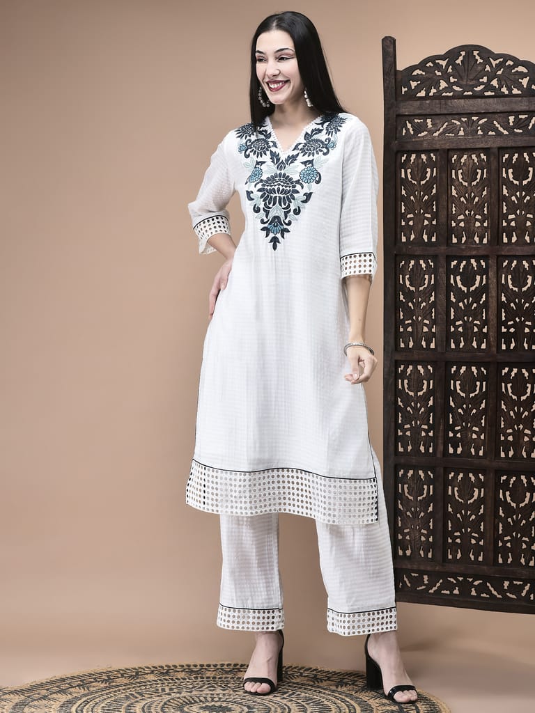 Women Viscose White Embroidered Kurta Comfort Pant Dupatta